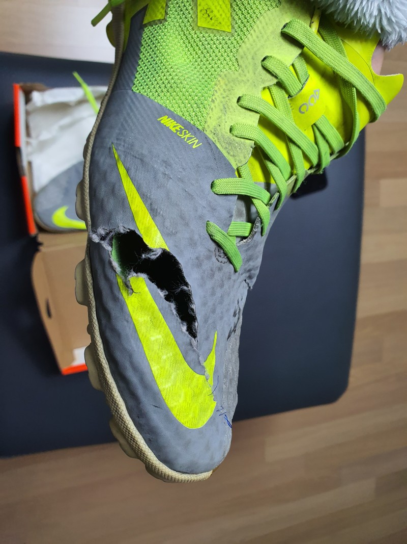 나이키 풋살화인데요 오른쪽 어퍼는 1, 2번에서 보시듯이 발등 양쪽이 굉장히 길게 찢어졌습니다.