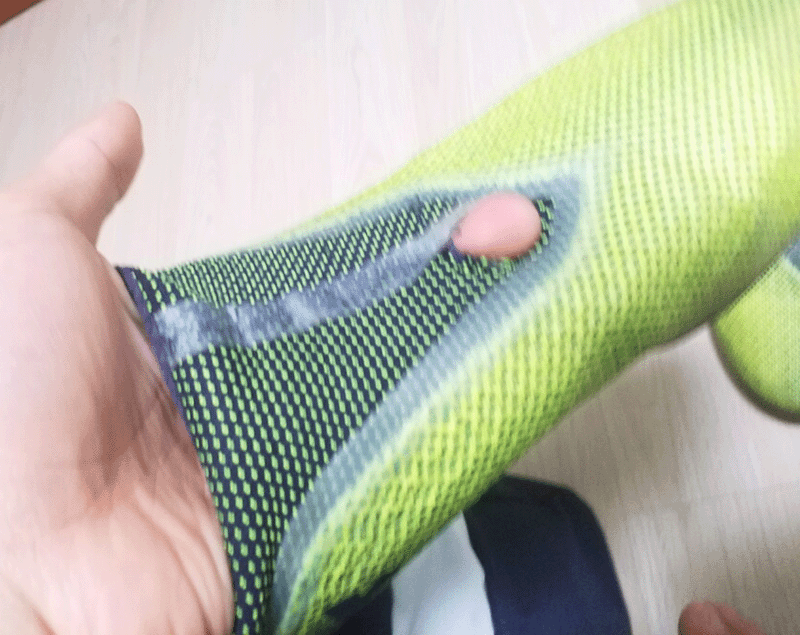 보시다 시피 어퍼 위쪽 니트부분으로 되있는 부분에 구멍이 뚫려있고 살짝 테이프 처럼 보이는 발등 접합부분도 떼어지려는듯 합니다...