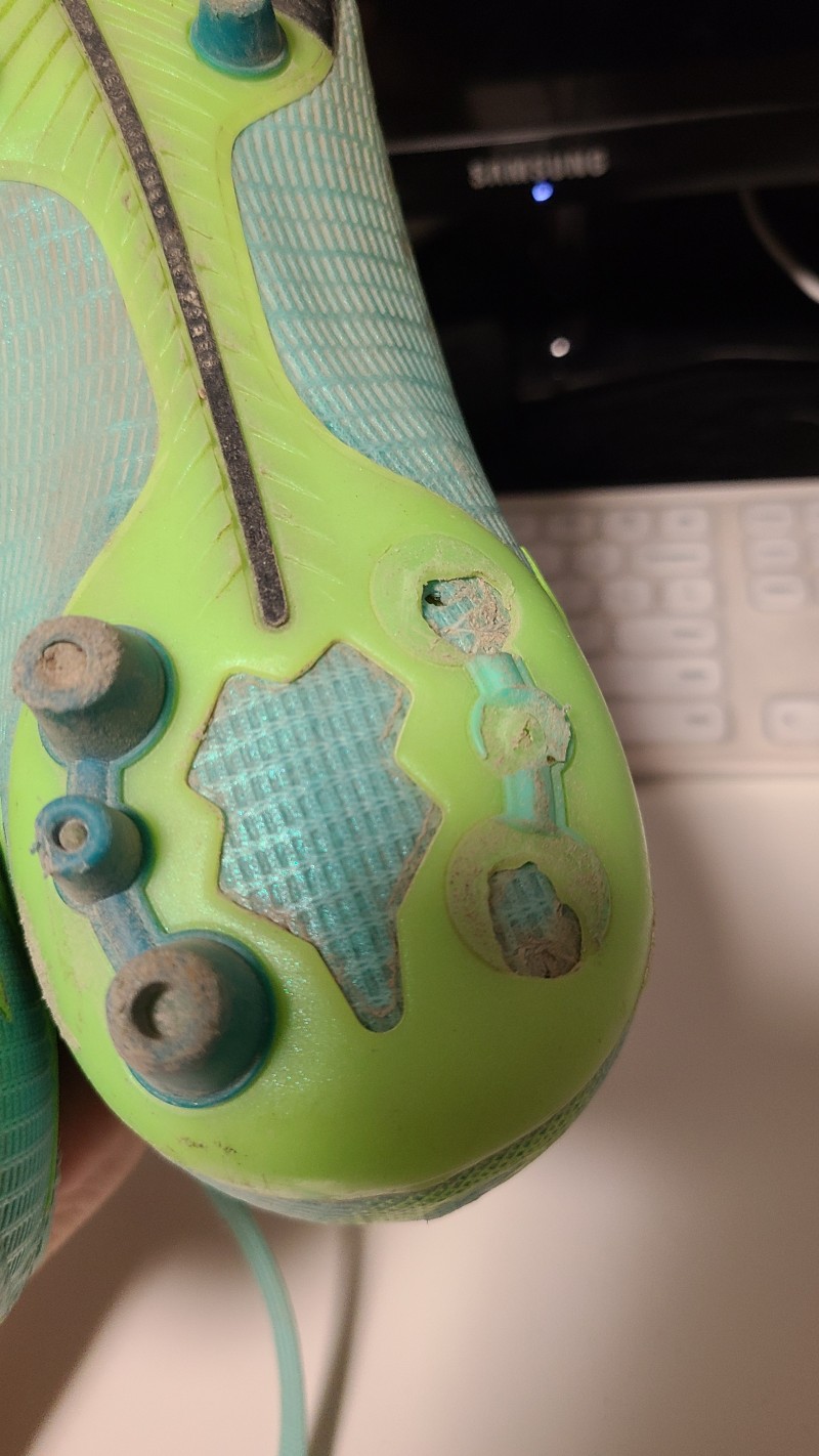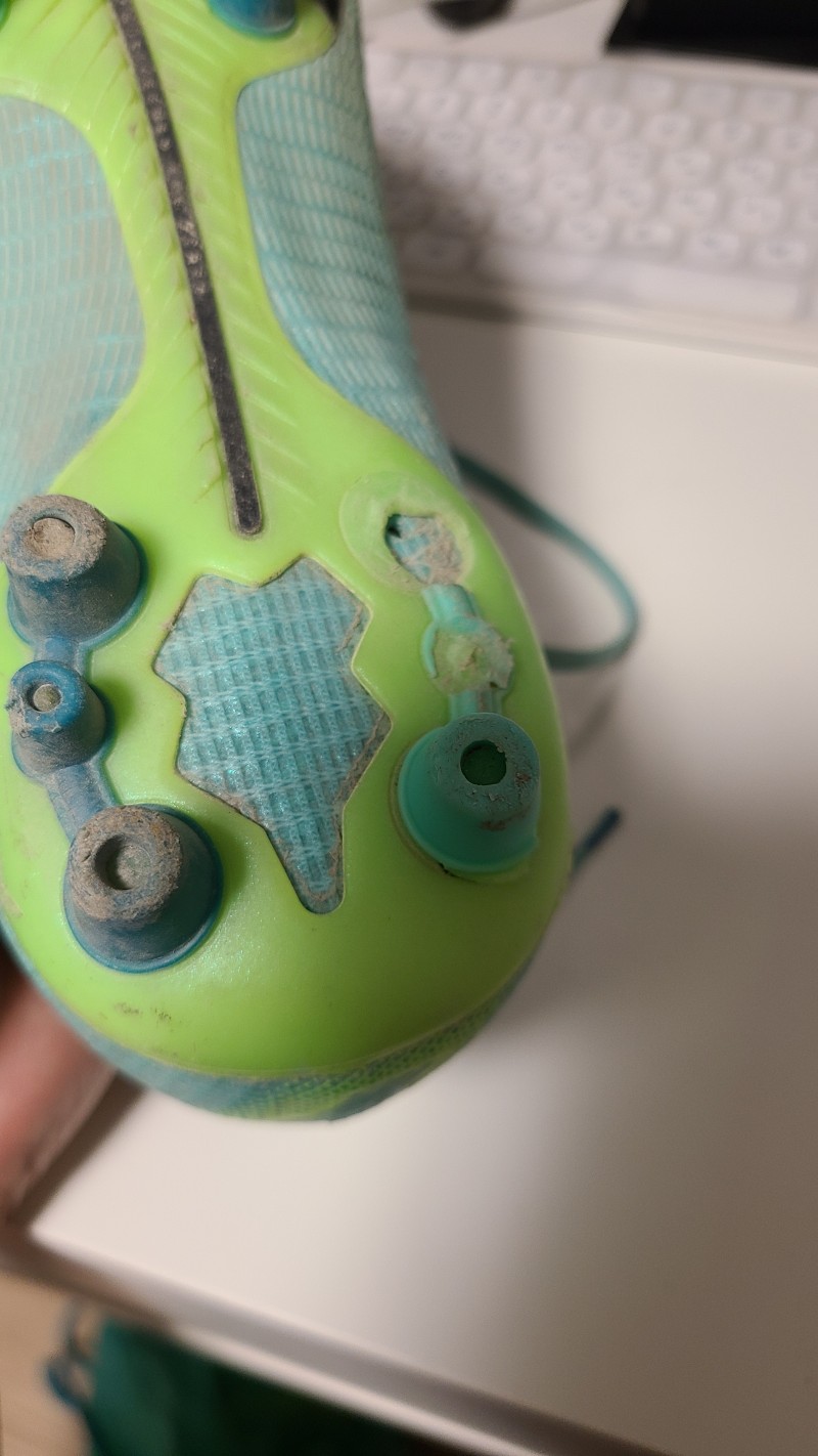 왼쪽발 발꿈치쪽 스터드 3개가 부러진 상태입니다