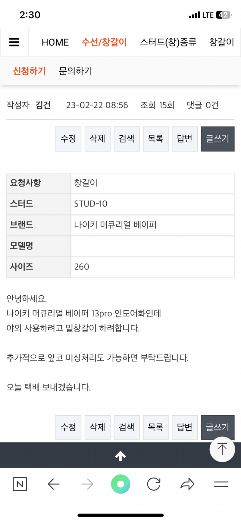 언제 받을수있는지 문의드립니다 페이지 정보 작성자 김건 작성일23-04-06 14:33 조회437회 댓글0건 이전글 다음글 수정 삭제 목록 답변 글쓰기 본문 2월 23일에 창갈이 신청 후 택배 발송드렸고, 24일에 수령하셨다고 연락 받아 입금 완료 했었습니다. 혹시 해당 신발 언제 받을 수 있는지 문의드립니다. 이전글 다음글 수정 삭제 목록 답변 글쓰기