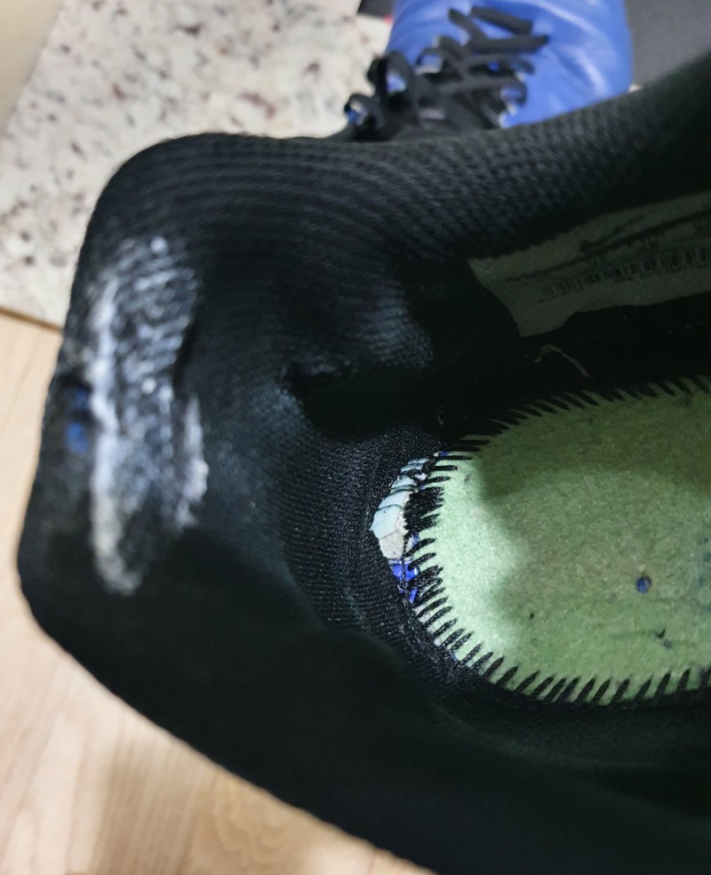 나이키 티엠포 풋살화 뒷꿈치 메쉬부분이 전체적으로 해지고 구멍이 났습니다 (양쪽 다)