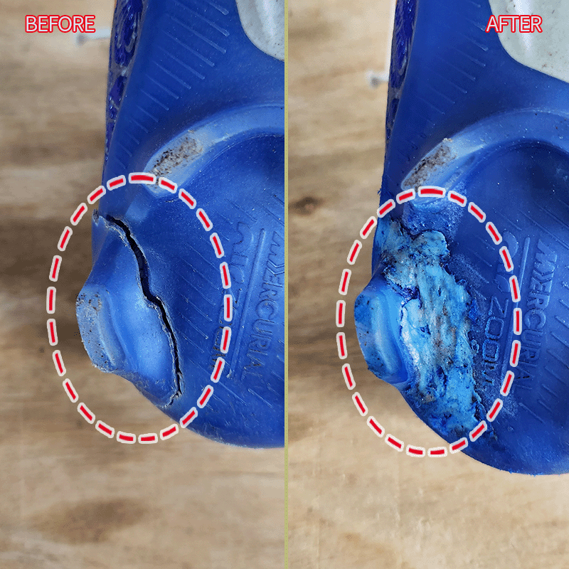 > 축구화 스터드밑창이 금이가서 떨어졌는데요.. 창갈이 말고 수선하고 싶어서요. 가능할까요?? 양쪽다 금이갔어요.