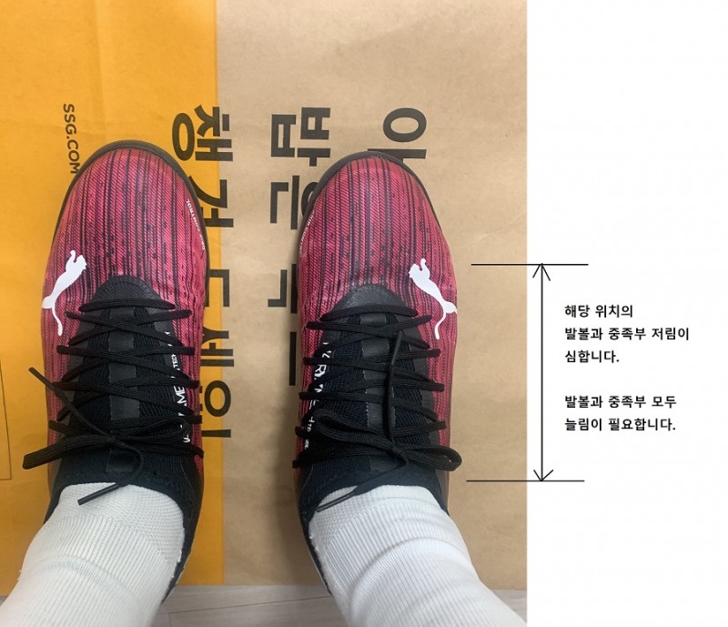 하지만 처음 신었을때 5분만에 발볼과 중족부 압박으로 발저림 및 통증때문에 풋살화 갈아신었습니다.