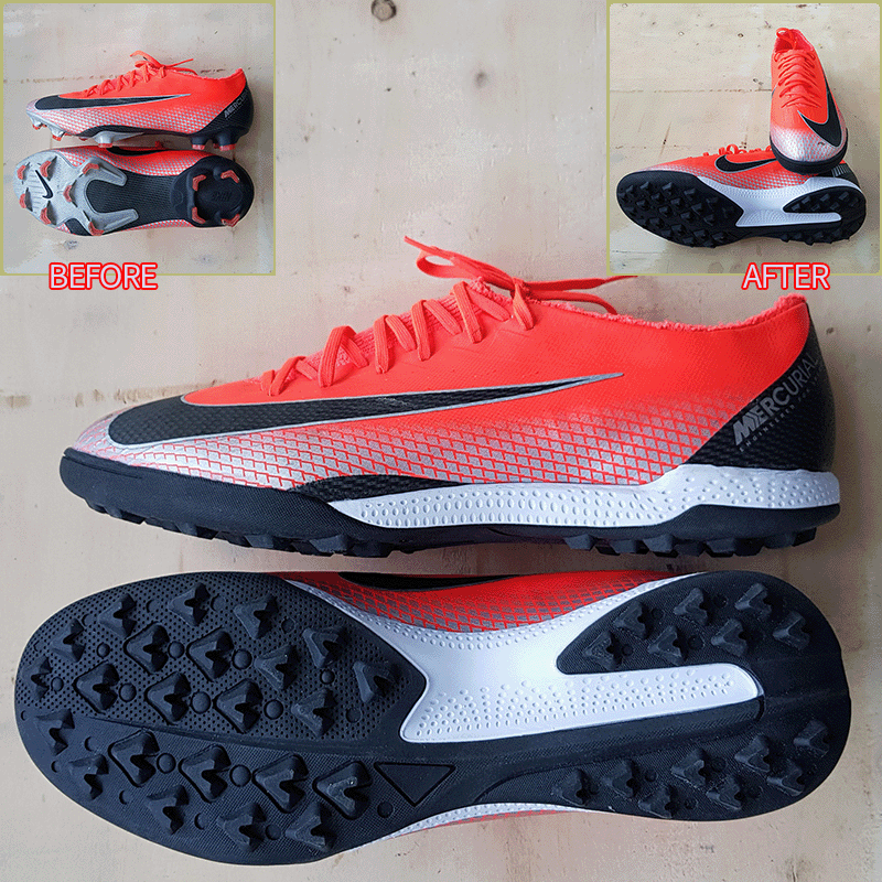 요청하신대로 기장 왼발 290mm, 오른발 285mm 맞추고, 볼은 왼발 5mm, 오른발 2~3mm 늘려서 창갈이를 해드렸으니 이젠 즐겁게 축구만 하시면 될것 같습니다^^