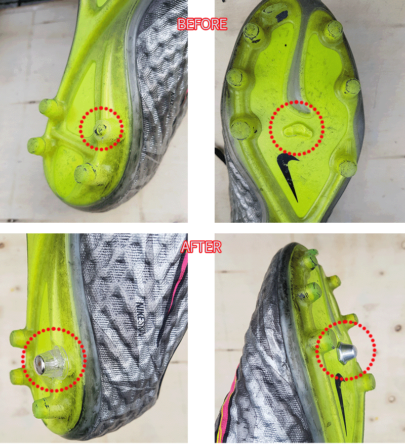 요청하신대로 부러지 스터드를 쇠뽕으로 수리하여 보내드렸으니 이제는 즐겁게 축구만 하시면 될것 같습니다.