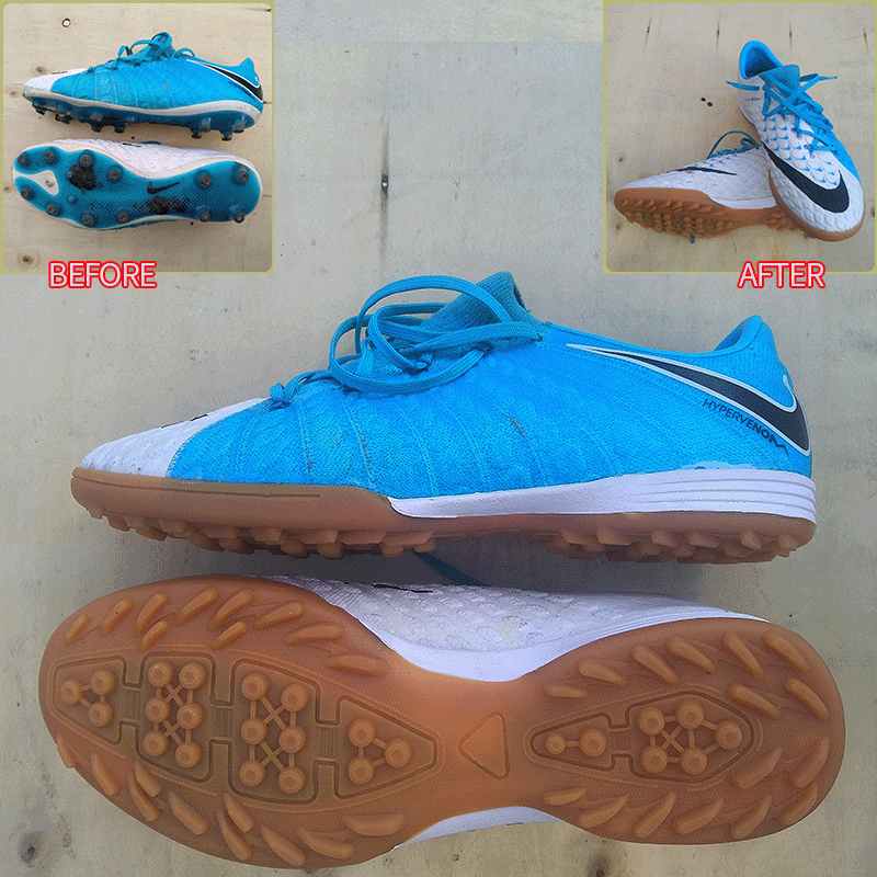 요청하신대로 기장만 5mm 줄이고 발볼은 손대지 않고, 중창도 살리고 창갈이를 했으니 이젠 편안하게 축구만 하시면 될것같습니다.