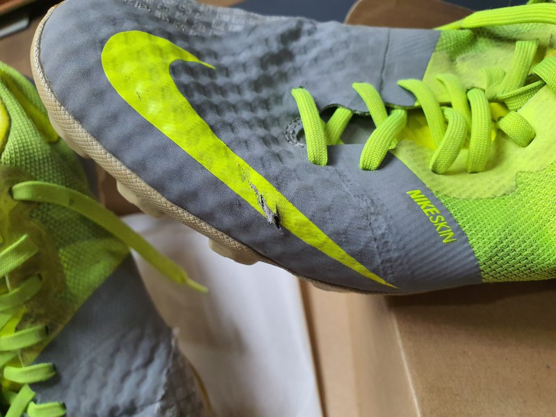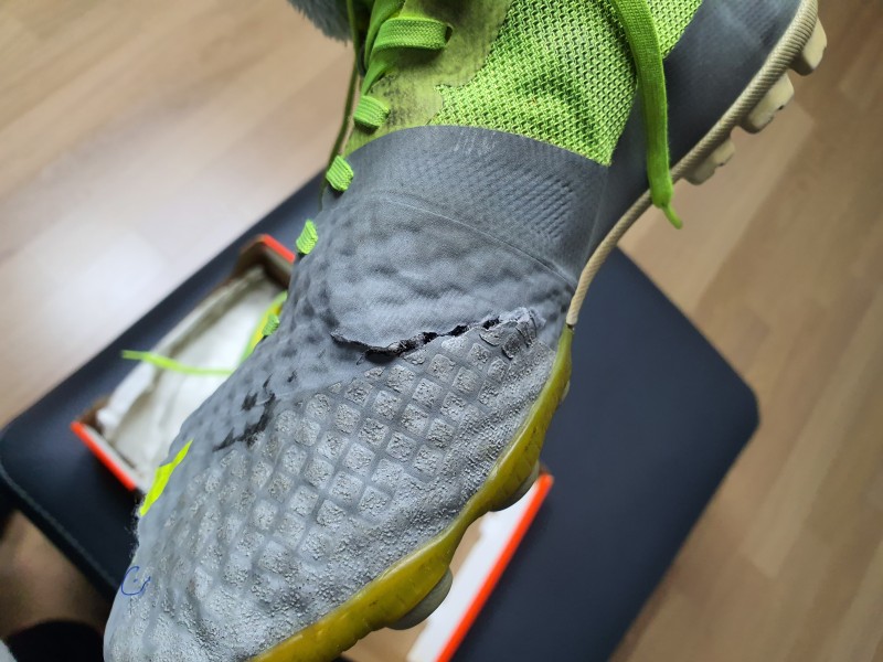 나이키 풋살화인데요 오른쪽 어퍼는 1, 2번에서 보시듯이 발등 양쪽이 굉장히 길게 찢어졌습니다.