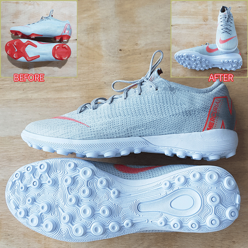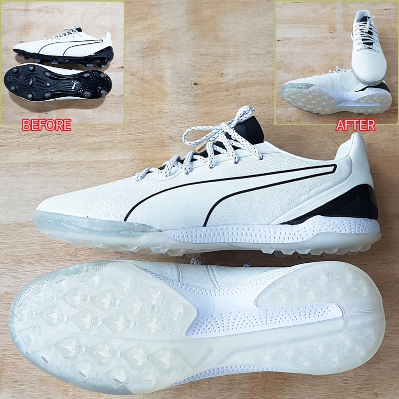 요청하신대로 두켤레 모두 현재사이즈 그대로, 퓨마는 10-1번창으로, 나이키는 13번창으로 창갈이를 해드렸으니 이젠 즐겁게 축구만 하시면 될것 같습니다^^