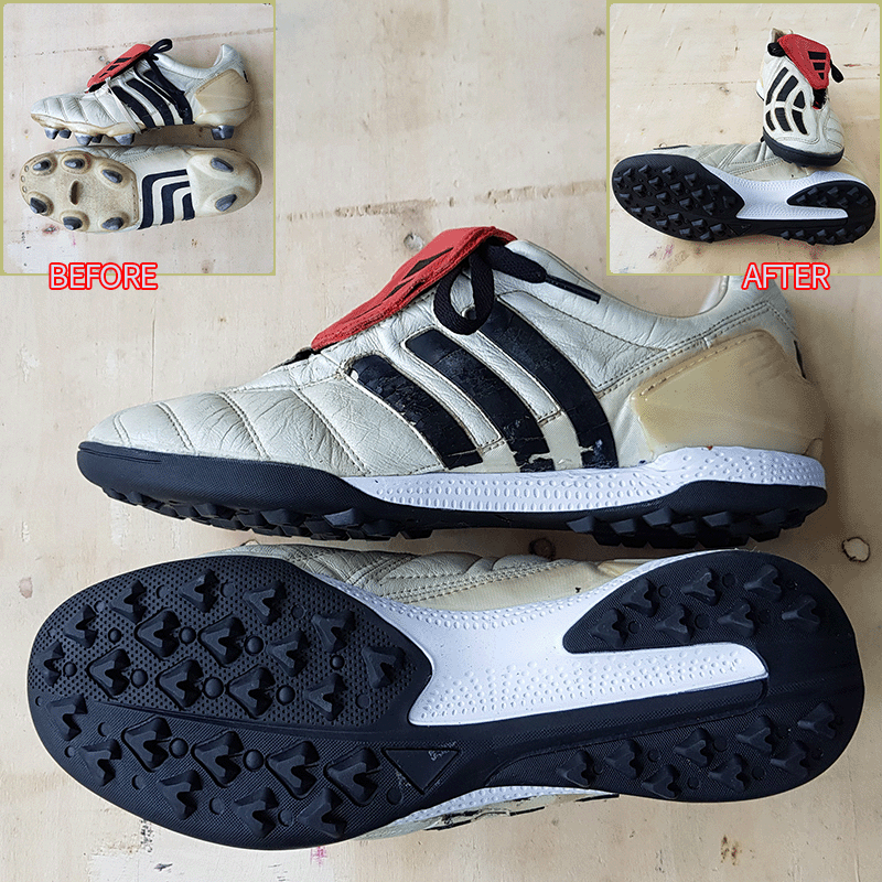 요청하신대로 두 켤레 모두 기장 275mm 맞추고, 볼은 현재에서 2~3mm 늘리고, 발등 5mm 늘려서 창갈이 해드리고, 텅 찍찍이 작업도 해드렸으니 이젠 즐겁게 축구만 하시면 될것 같습니다^^