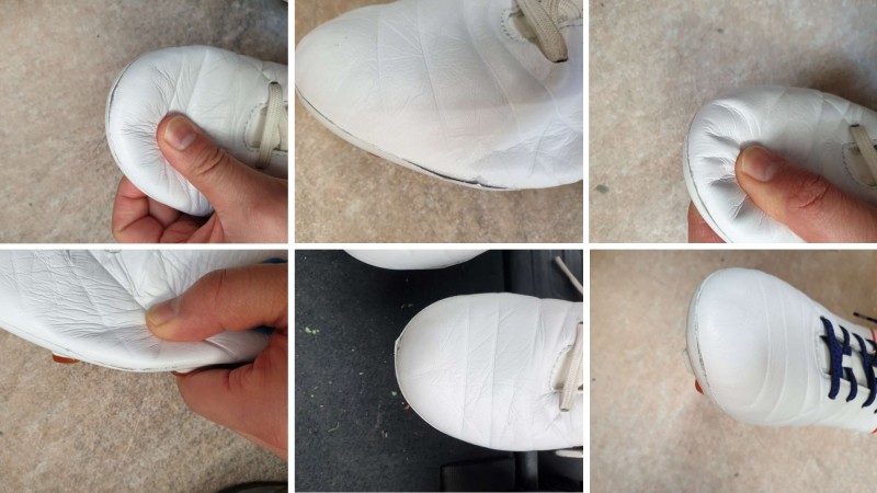 캥거루 가죽 흰색 축구화이며, 둘다 비슷한 색 가죽 덧댐 부탁드리구요.