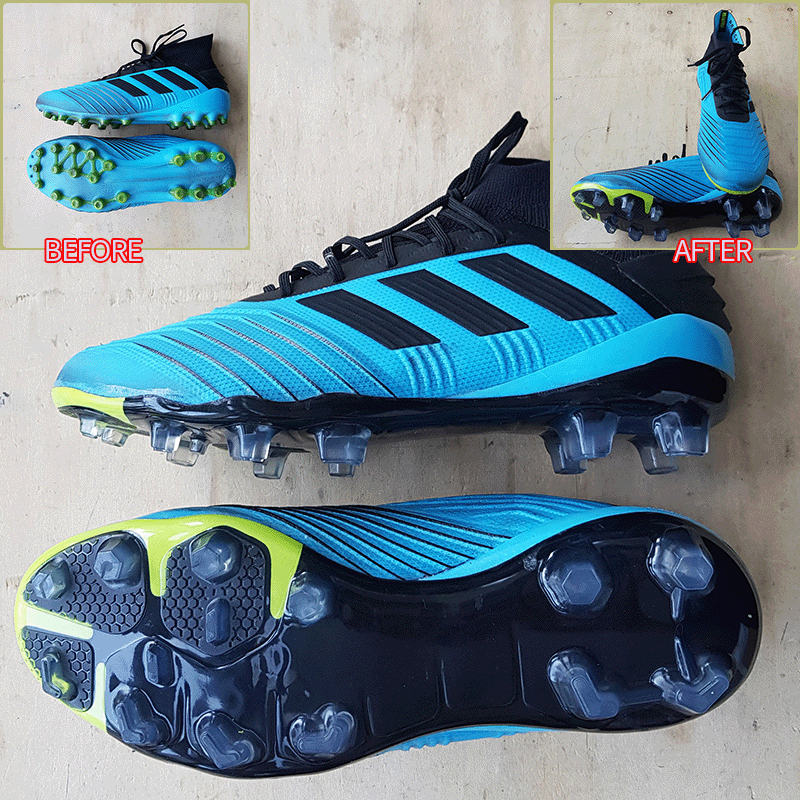 요청하신대로 오른발 엄지쪽 기장만 5mm 늘리고 스터드 2mm 정도 커팅하여 창갈이를 해드렸으니 이젠 즐겁게 축구만 하시면 될것 같습니다^^