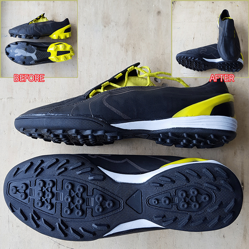 요청하신대로 기장 왼쪽5mm 오른쪽 3mm 줄여서 창갈이, 끈 코 부분 쿠션 덧댐하여 창갈이를 해드렸으니 이젠 즐겁게 축구만 하시면 될것 같습니다^^